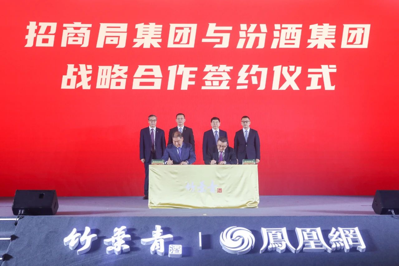 与会领导嘉宾为新品揭幕,并见证了招商局集团与汾酒集团战略合作协议签署仪式,竹叶青酒新品“天享”系列正式发布。