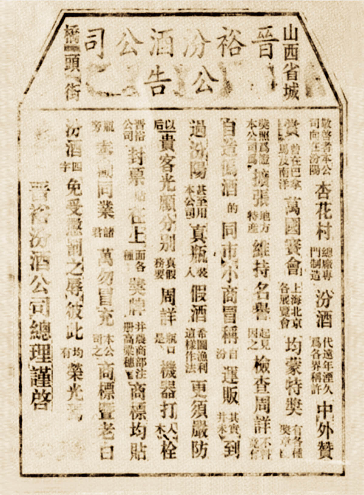 1875年(清光绪元年),汾阳杏花村“宝泉益”酒坊成立,汾酒进入企业时代。从1904年起,杏花村汾酒业就在杨德龄带领下开始研配制药酒、果露酒,并形成了中国白酒业第一个以白酒为主,配制酒、黄酒为辅的完整产品品牌体系。1915年,汾酒远渡重洋,在巴拿马万国博览会上大放异彩,摘得中国品牌白酒甲等大奖唯一桂冠。1919年晋裕汾酒有限公司在太原成立,建立了中国白酒第一个现代企业制度。1924年,晋裕汾酒公司注册了中国白酒业的第一枚注册商标——高粱穗汾酒商标。1948年7月汾阳全境解放,受中共晋中党委后勤部委派,杨汉三、侯雪东、畅俊卿等三人组织恢复汾酒生产,并暂定名:汾阳杏花村专营酒店。完成了区党委交给的“让解放区的人民在中秋节喝上汾酒”的任务。1949年5月20日,山西省人民政府以1.76万元购买了晋裕公司和德厚成酒坊全部产业,于6月1日成立汾阳杏花村公营酒厂。1949年9月,第一届中国人民政治协商会议上,杏花村汾酒厂生产的汾酒、竹叶青酒作为国宴用酒摆上了餐桌。汾酒因此成为新中国成立以来最早的国家庆典用酒。1988年5月,经省政府批准,以山西杏花村汾酒厂为核心企业,组建了杏花村汾酒集团,升格为国家大型一档企业。1993年12月22日,山西杏花村汾酒厂股份有限公司在上海证券交易所上市。中国第一家白酒类上市公司诞生。